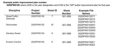 A project name string, one or two chars set per table, one digit, period, two digits, optional decimal and digit, space, a sheet title string, .PDF |